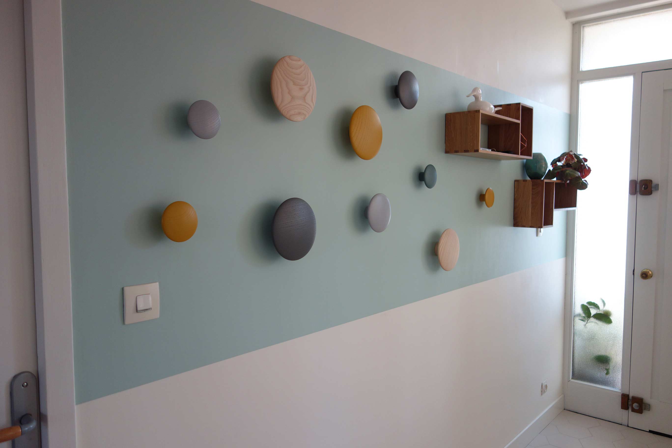 Dans l'entrée, une large bande verte sur le mur anime le lieu et met en scène les patères ainsi que les étagères en bois.