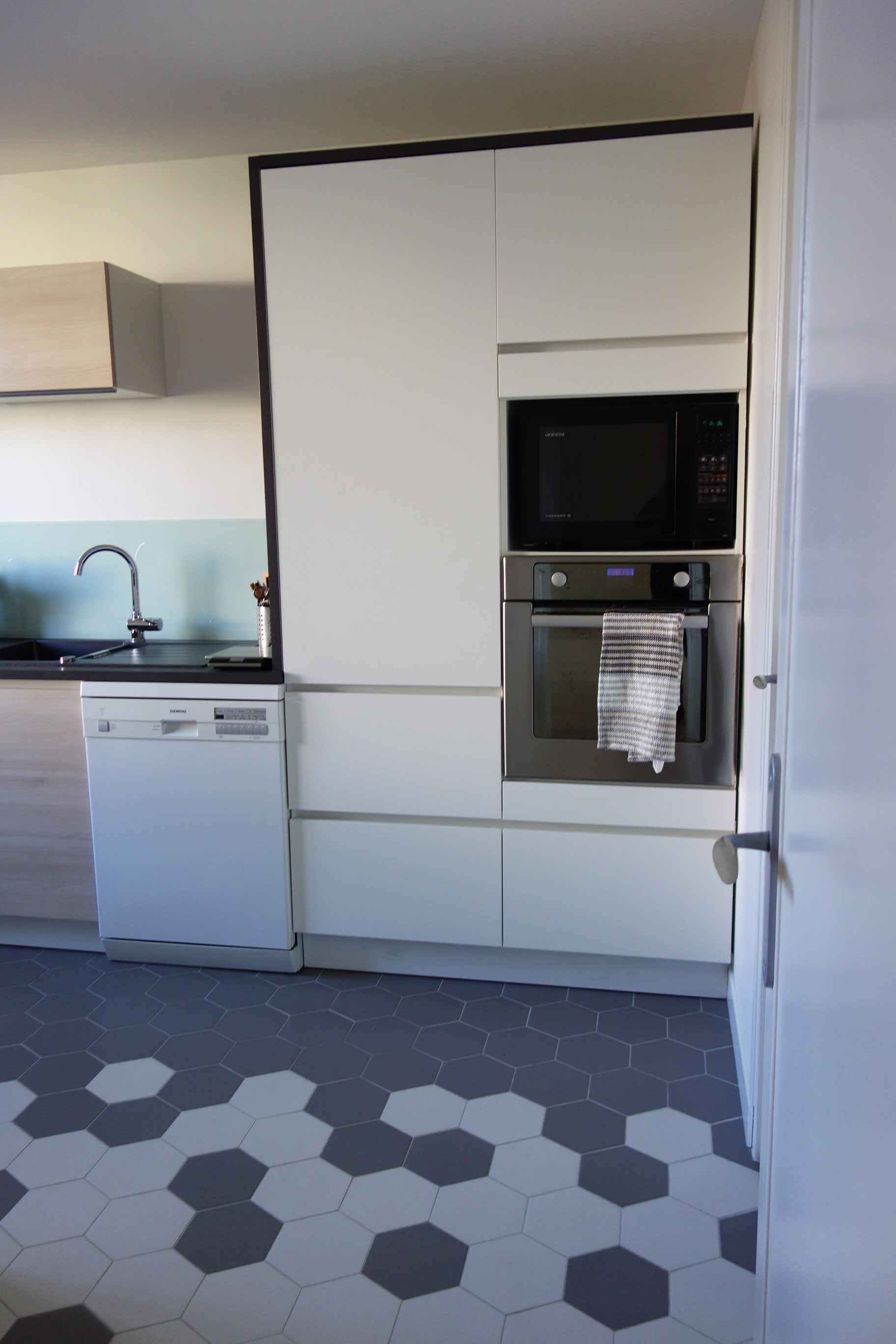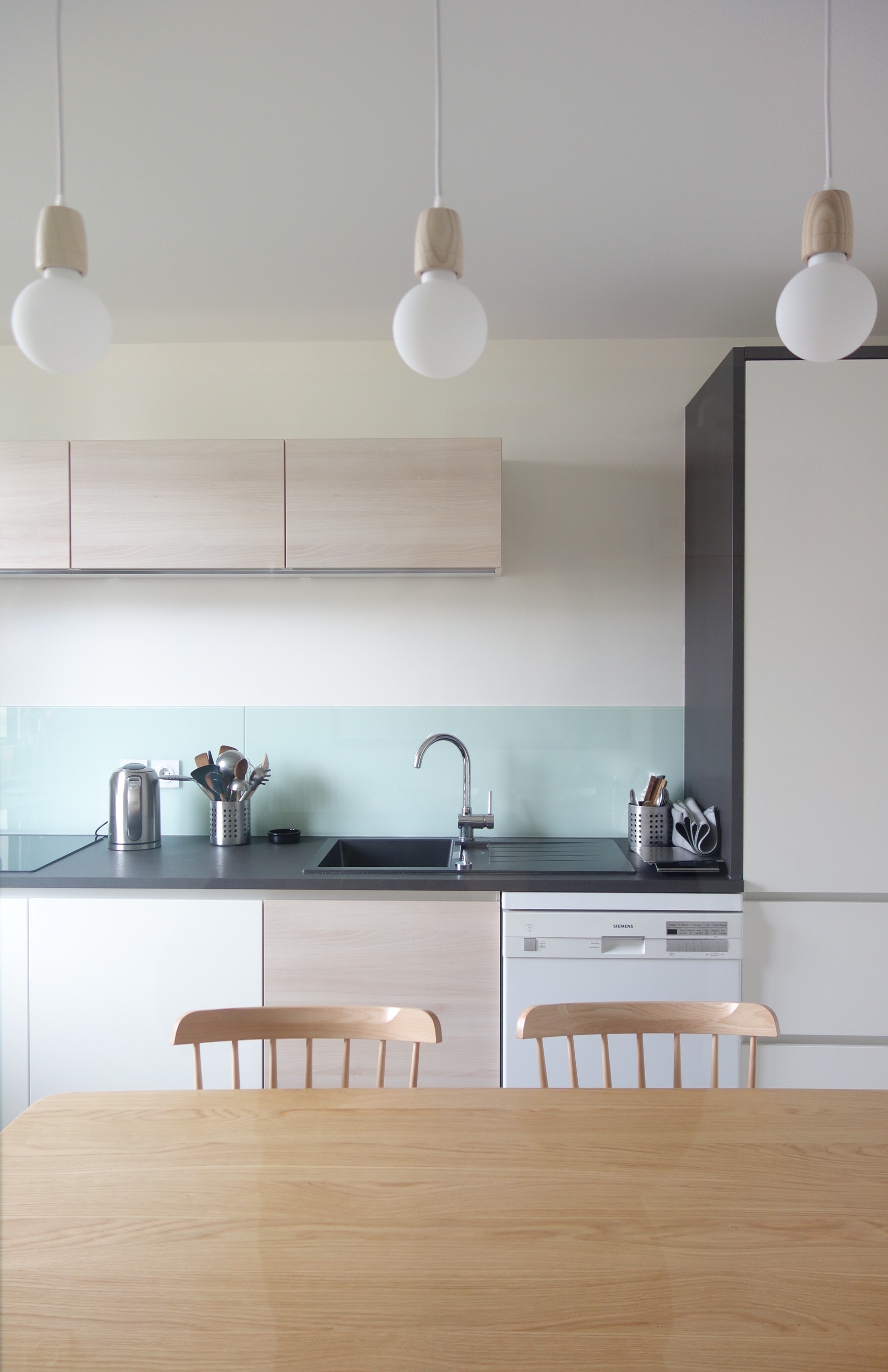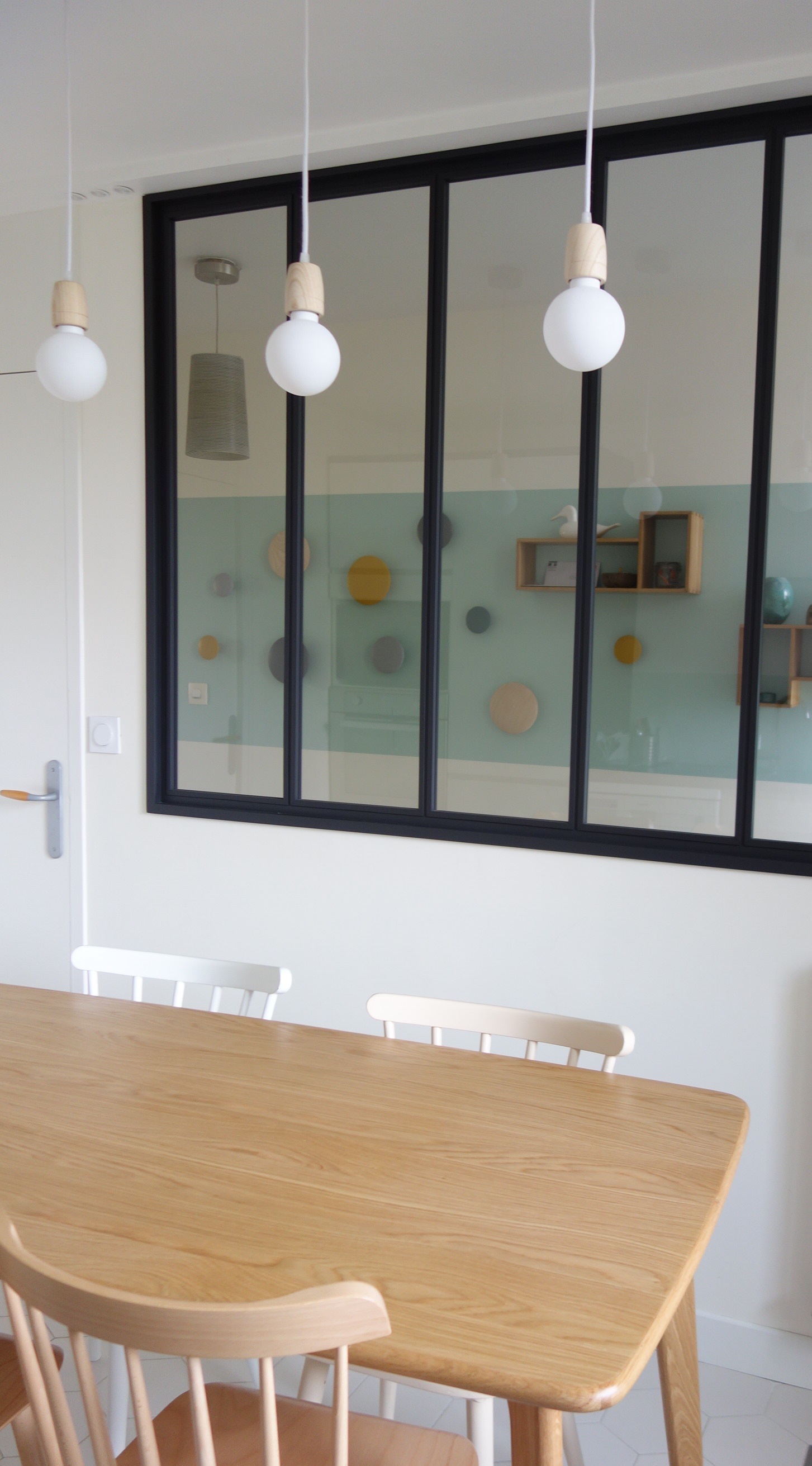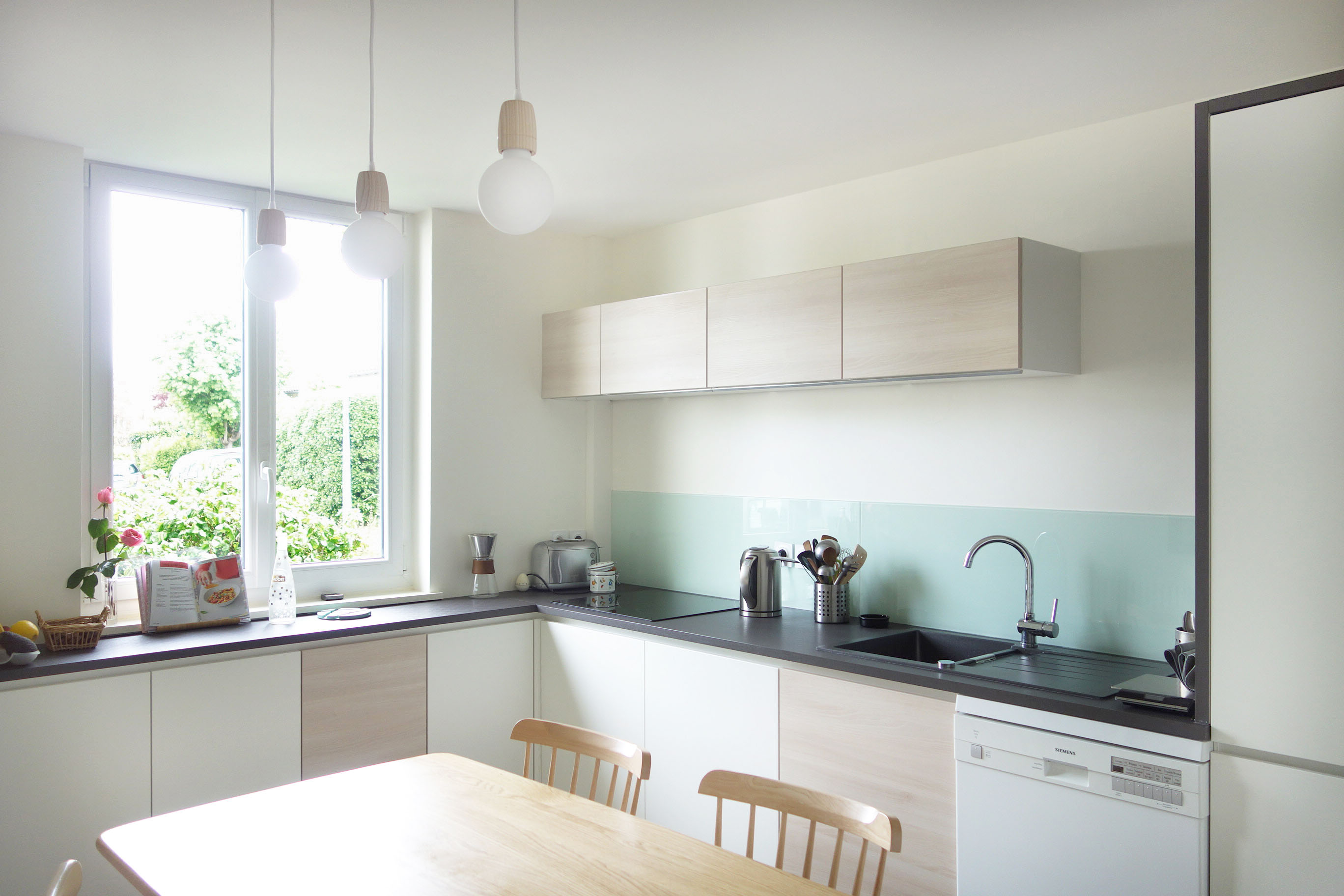 Dans cette cuisine aux meubles clairs se détache un ruban continu créé par le plan de travail qui se déploie dans l'espace et donne une unité à l'ensemble. Au gris anthracite de ce ruban répond la couleur de la verrière, élément qui permet la transparence entre l'entrée et la cuisine.